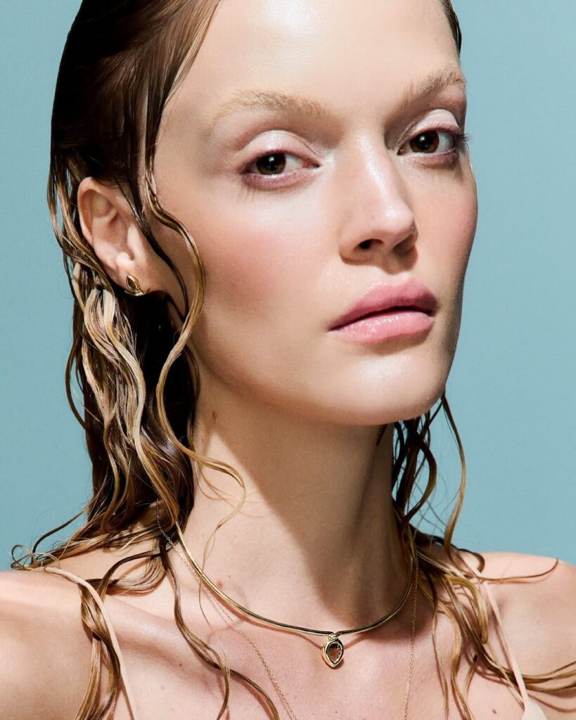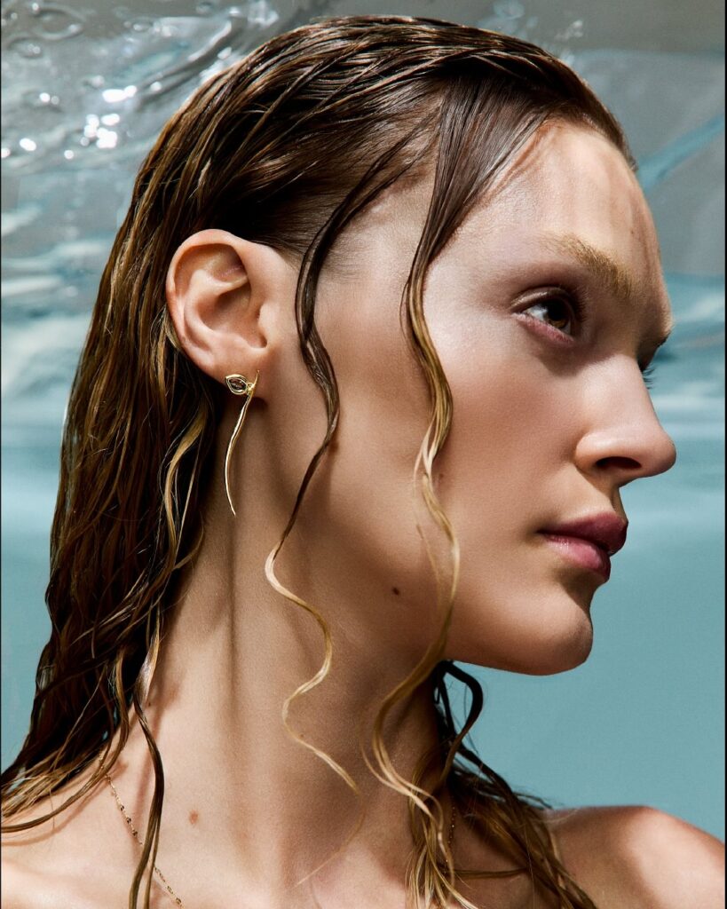 Marina Streb, em fotos de Mateus Augusto Rubim (Matching Digital), styling de Lucas Magno (No Title), beleza de Paula Kadija, cenografia de Nana Martins, produção executiva de Joanna Gabriel e tratamento de imagens de Nanda Carnevali, na campanha da coleção Mar Aberto da joalheira Animale Oro.